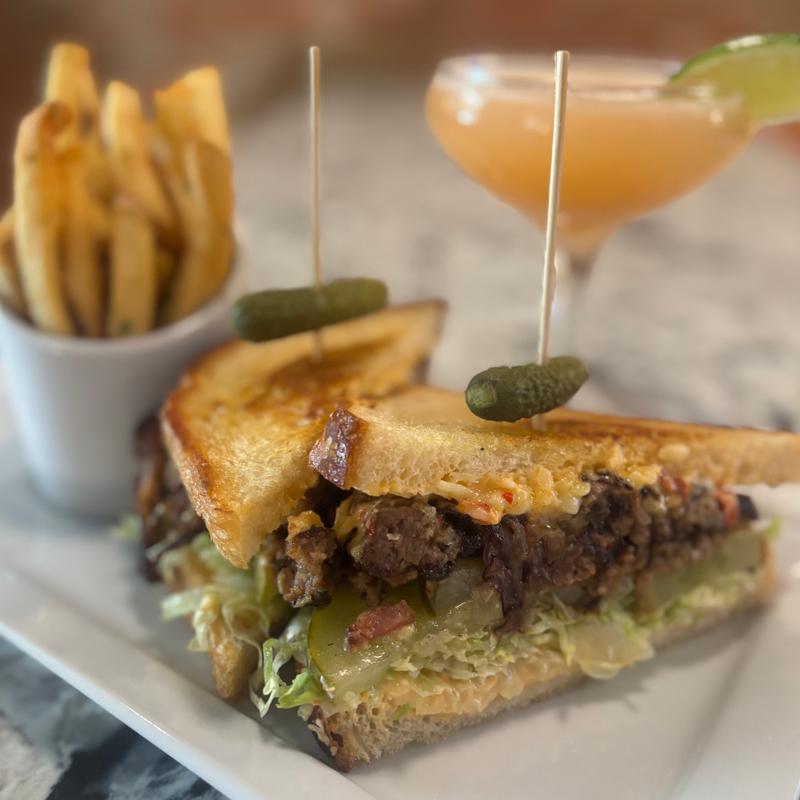 ACME griddled sourdough, chef Josh's famous meatloaf, pimento cheese, griddled onion, lettuce, pickle, with truffle fries
