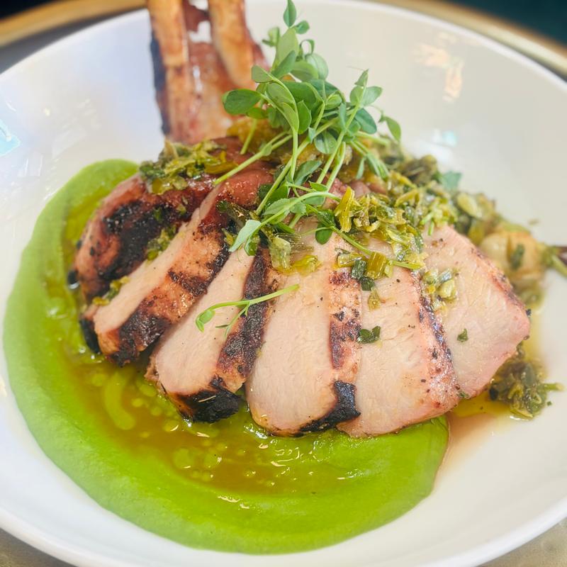 sixteen ounce tomahawk, duroc chop, english pea purée, roasted radish and turnip, onion jam, charred spring onion pistou