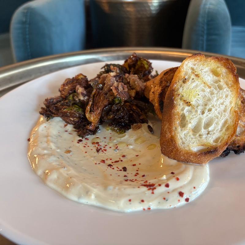 5 spice brussels, vegan herb feta, candied pecans, hot honey, lemon oil, grilled baguette (vegan)