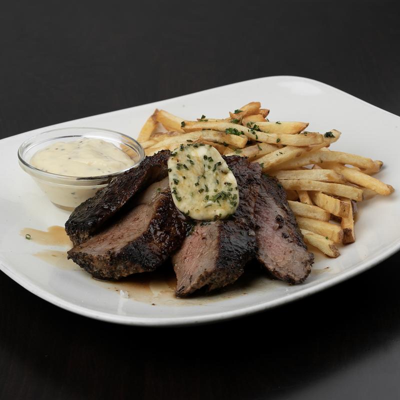 seven ounce american wagyu bavette, garlic aioli, demi, mezcal butter, truffle fries • add grilled lobster tail +31, add garlic crab claws +24